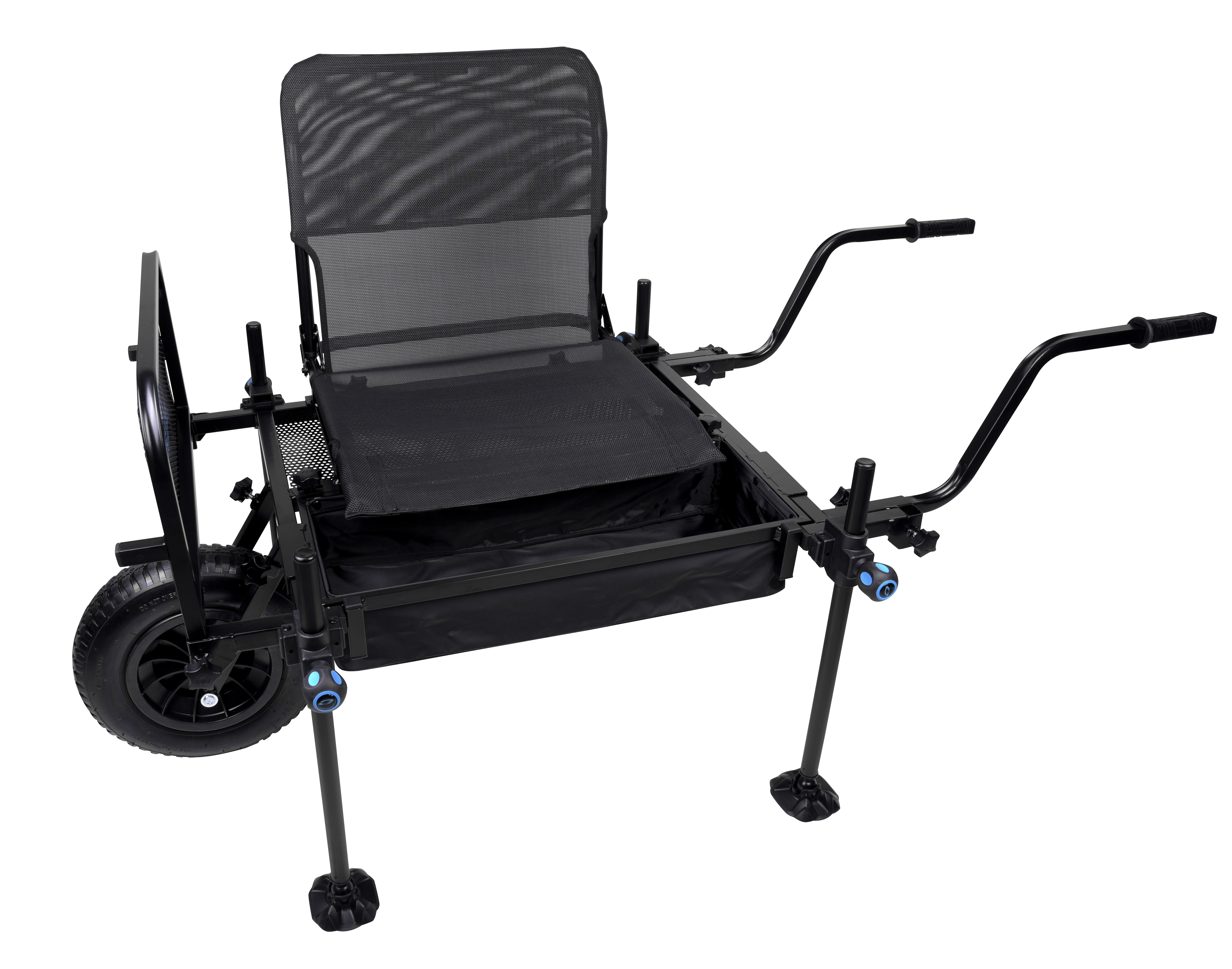 Dieser Blackthorne Barrow-Sitz von Cresta kombiniert den Komfort eines Stuhls mit der Stabilität einer Sitzbox oder Plattform und verfügt über ein Barrow-System mit integrierten Seitenplattformen. Dies macht den Barrow-Sitz ideal für Angler, die ihre Ausrüstung kompakt und mobil zusammenstellen möchten. Der Klappsitz besteht aus Kunststoff, nimmt also kein Wasser auf. Um die Oberfläche des Barrow während des Transports optimal nutzen zu können, wurde der Sitz auf einen abnehmbaren Rahmen gestellt. Das gesamte Setup ist am Wasser dank der 4 individuell einstellbaren 25-mm-Beine, die mit breiten und neigbaren Schlammfüßen ausgestattet sind, sehr stabil. Das robuste, kratzfeste Spannsystem ist mit Anti-Rutsch-Knöpfen zum festen Fixieren ausgestattet. Das Schubkarrensystem verfügt über einen großen Luftreifen (36cm Durchmesser) und 2 robusten Griffen in der richtigen Länge, die mit Gummigriffen ausgestattet sind. Das Schubkarrensystem ist perfekt ausbalanciert und leicht zu lenken, sodass das Begehen von holprigen oder weichen Oberflächen überhaupt kein Problem darstellt. Der mitgelieferte Metall-Ködertisch bietet Platz für zahlreiche Zubehörteile und Ködertypen in horizontaler Position. Dieser Ködertisch befindet sich in vertikaler Position und bildet eine erhöhte Kante, an der eine Tasche oder andere Gegenstände für einen sicheren Transport abgelegt werden können. Die EVA-Tasche bietet Stauraum für Zubehör und dank des Designs ist der Rahmen für den Transport verstärkt. Einmal herausgenommen, kann der EVA-Beutel einfach auf die Seite gelegt werden. Beide Seitenregale haben ein ausgeklügeltes Format, das auf die CRESTA EVA-Reihe zugeschnitten ist, und beide können auf beiden Seiten montiert werden. Durch die Position des Sitzes und den offenen Raum zwischen den 4 Beinen wird beim Sitzen auf dem Stuhl eine gute Kraftverteilung auf den Rahmen geschaffen, sodass ein Verkanten verhindert wird und das gesamte Produkt sehr stabil ist.