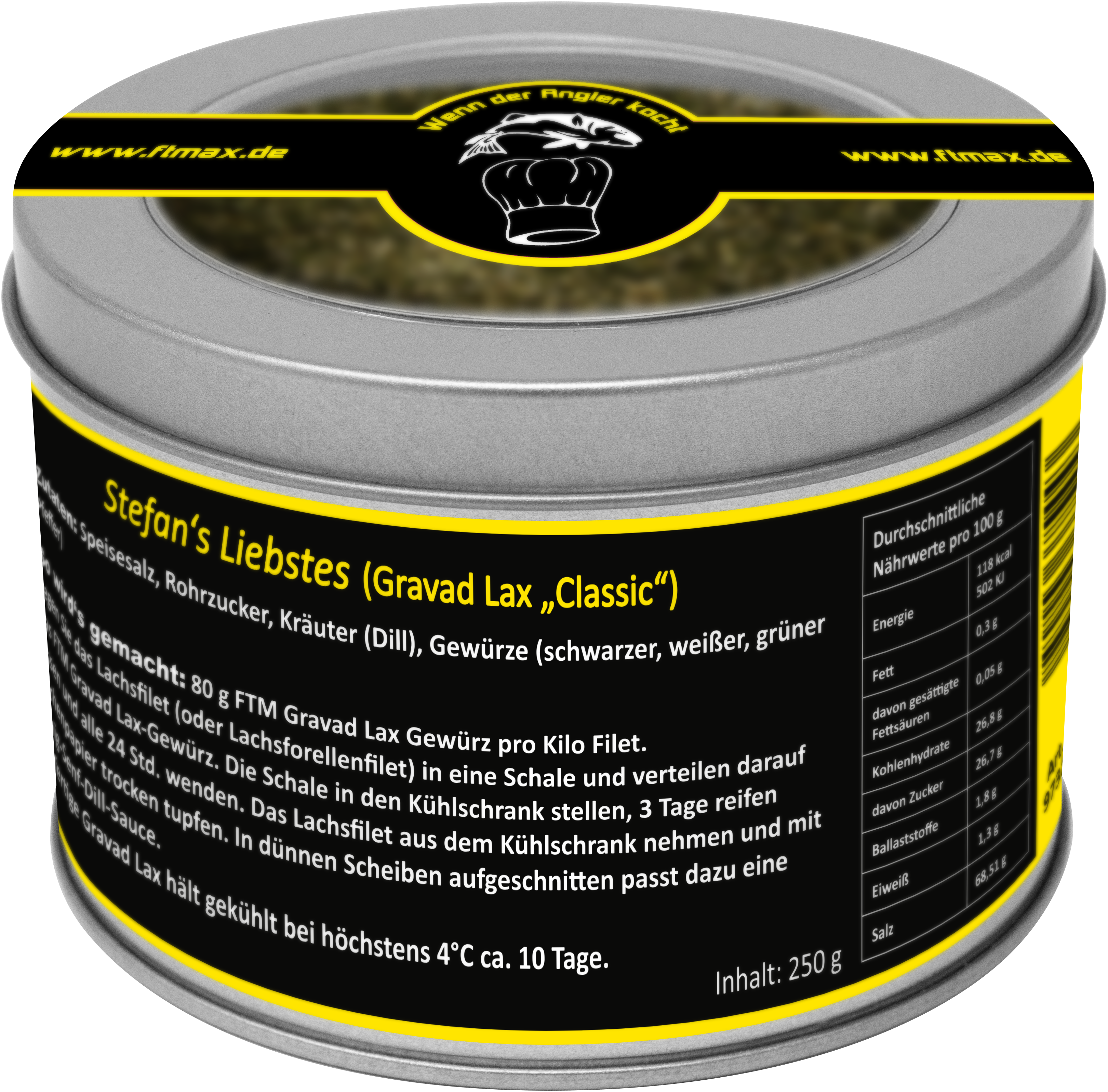 Sie benötigen 80 g FTM Gravad Lax Gewürz pro Kilogramm Filet. Legen Sie das Lachs-/Lachforellen-Filet in eine Schale und verteilen darauf das FTM Gravadlachs-Gewürz. Lassen Sie den Fisch zwecks Salzgarung/Reifung für 3 Tage im Kühlschrank. Einmal täglich wenden. Bei wenig Platz das Filet vakuumieren. Nach 3 Tagen das Filet aus dem Kühlschrank nehmen und mit Küchenpapier trocken tupfen. Serviervorschlag: In dünnen Scheiben mit Honig-Senf-Dill-Sauce. Haltbar für 10 Tage bei mind. 4 °C.
