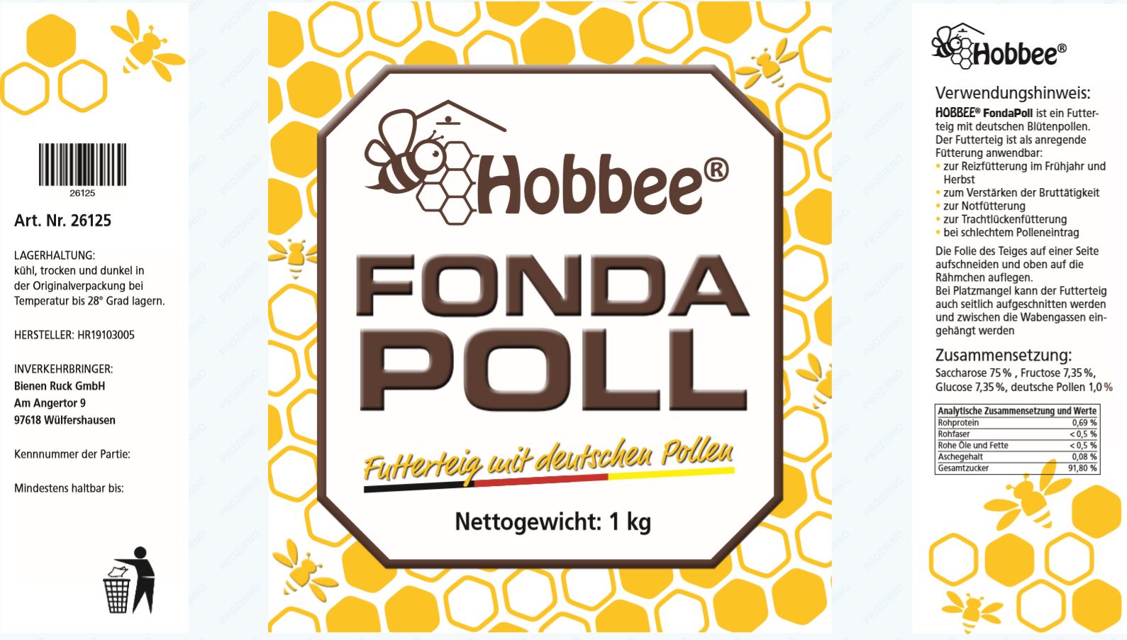 Zusammensetzung: Saccarosee 75 %, Fructose 7,35 %, Glucose 7,35%, deutscher Pollen 1,0 %